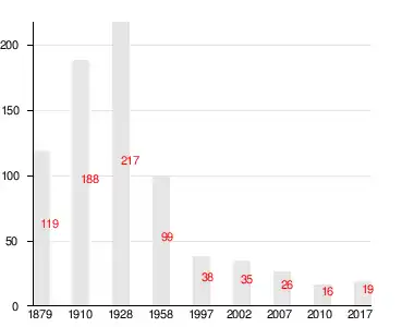 Число жителей по семейным спискам 1879 г.: 61 м. п., 58 ж. п.; по приходским сведениям 1879 г.: 50 м. п., 47 ж. п.[2]