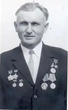 - Герой Социалистического Труда — указом Президиума Верховного Совета СССР от 11 января 1957 года «за особо выдающиеся успехи, достигнутые в работе по освоению целинных и залежных земель, и получение высокого урожая»[1]