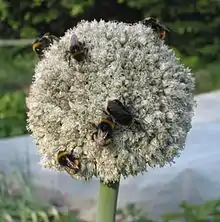 Зонтик большой, шаровидный; околоцветник беловатый или реже розоватый, со слегка шероховатыми листочками. Нити тычинок длиннее околоцветника, внутренние трёхраздельные, со средней частью в два раза короче основания.