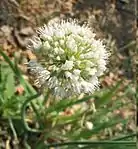 Зонтик шаровидный, реже почти шаровидный, многоцветковый, густой, почти головчатый, до цветения поникающий. Листочки полушаровидного околоцветника розовые или розово-фиолетовые с мало заметной жилкой, длиной 4—6 мм, тупые, продолговато-яйцевидные, внутренние немного длиннее наружных лодочковидных. Нити тычинок при самом основании между собой и с околоцветником сросшиеся, в полтора-два раза длиннее листочков околоцветника, шиловидные, внутренние при основании обычно двузубые, в 2 раза шире наружных. Столбик выдается из околоцветника.