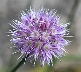 Чехол коротко заострённый, немного короче зонтика, остающийся. Зонтик полушаровидный или шаровидный, многоцветковый, густой. Цветоножки почти равные, в полтора—три раза длиннее околоцветника, при основании без прицветников. Листочки колокольчатого околоцветника блестящие, розовые, с более тёмной жилкой, продолговато-ланцетные, острые, длиной 5—7 мм Нити тычинок немного короче или едва длиннее листочков околоцветника, при основании между собой и околоцветником сросшиеся, цельные, наружные шиловидные, внутренние от основания постепенно суженные. Столбик немного выдается из околоцветника.