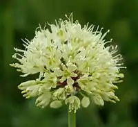 Соцветие — шаровидный или, реже, полушаровидный, довольно густой, многоцветковый зонтик, до цветения поникающий и заключённый в чехол. Околоцветник венчиковидный, звёздчатый, двухрядный, с шестью лепестками; листочки околоцветника эллиптические, беловато-зеленоватые, с малозаметной жилкой, наружные немного уже и короче. Лепестки эллиптические, туповатые, длиной 4—5 мм, беловато-зеленоватые, с одной малозаметной жилкой. Тычинок шесть, нити почти в полтора раза длиннее околоцветника, при самом основании с сросшиеся, цельные, узкотреугольные; пестик с верхней трёхгнёздной завязью; столбик выдаётся из околоцветника. Цветёт в середине лета.