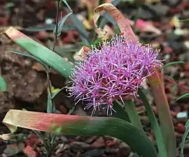 Чехол коротко заостренный, до 3 см длины, почти в 2 раза короче зонтика, остающийся. Зонтик пучковатый, густой, немногоцветковый, диаметром до 6,5 см. Цветоножки обычно равные, толстые, немного длиннее околоцветника. Листочки звездчатого околоцветника розово-пурпурные (лиловые), линейно-продолговатые, узкие, 12—14 мм длиной и до 1,5—2 мм шириной, обычно после цветения несколько скручивающиеся во внутрь, концы вниз отогнутые. Диаметр цветка — до 2,5—3 см. Нити тычинок в два раза короче листочков околоцветника. Пыльники желтые. Завязь на короткой ножке. Тычинки и пестик сильно выдаются из околоцветника.