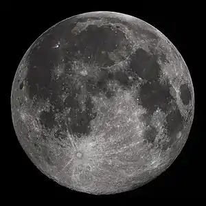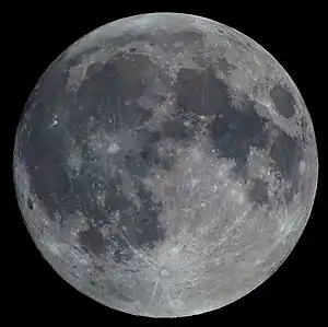 Видимая звёздная величина полной Луны на земном небе — −12,71m[5]. Освещённость, создаваемая полной Луной возле поверхности Земли при ясной погоде, составляет 0,25—1 лк.