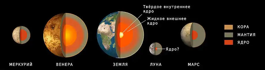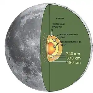 Луна состоит из коры, мантии (астеносферы), свойства которой различны и образуют четыре слоя, кроме того, переходной зоны между мантией и ядром, а также самого ядра, которое имеет внешнюю жидкую и внутреннюю твёрдую[16] части[17]. Атмосфера и гидросфера практически отсутствуют. Поверхность Луны покрыта реголитом — смесью тонкой пыли и скалистых обломков, образующихся в результате столкновений метеоритов с лунной поверхностью. Ударно-взрывные процессы, сопровождающие метеоритную бомбардировку, способствуют взрыхлению и перемешиванию грунта, одновременно спекая и уплотняя частицы грунта. Толщина слоя реголита составляет от долей метра до десятков метров[18].