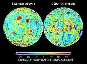 Смещение центра масс к центру фигуры CM/CF составляет приблизительно 1,68—1,93 км, при этом толщина лунной коры в среднем меньше на 8—12 км в том полушарии, которое обращено к Земле. По отношению к центру масс, противоположная сторона находится в среднем на 3,2 км дальше по сравнению с лицевой стороной. Средняя толщина коры на 8—12 км больше на противоположной стороне по сравнению с лицевой стороной. Экваториальная кора в среднем на 9,5 км толще, чем на полюсах[19].