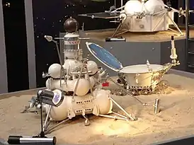 ![]() Экспозиция макетов советских «лунников» на выставке в Париже 2007 г. На переднем плане — АМС «Луна-20». В его составе — спускаемый аппарат, доставивший на Землю образцы лунного грунта (верхняя сфера). | |
