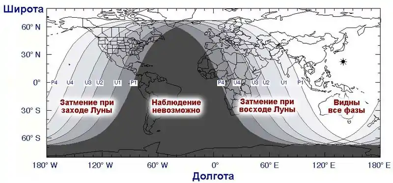 На западе США, востоке Африки и Европы наблюдались лишь частные фазы затмения (при заходе и восходе Луны соответственно).