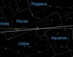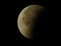 ![]() На изображении показаны почасовые положения Луны в период времени, близкий к затмению (Луна двигается с запада на восток, то есть справа налево). В 16 градусах к востоку от Луны в ночь затмения при помощи оптических инструментов можно было наблюдать Уран (зв. вел. 5,7). Жёлтая линия — эклиптика. В центре снимка обозначены земная тень и полутень | |
