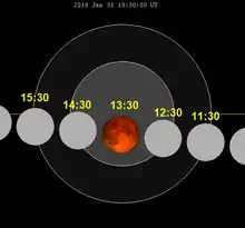Лунное затмение 31 января 2018 года началось в 10:51 и закончилось в 16:08 (UTC)[6].