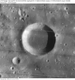 Лунным кратером называется чашеобразное углубление в поверхности Луны, имеющее сравнительно плоское дно и окруженное кольцевидным приподнятым валом. В соответствии с современными представлениями абсолютное большинство лунных кратеров являются кратерами ударного типа. Незначительная часть лунных кратеров до сих пор считается вулканическими кальдерами[1].