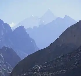 ![]() Каракорум на рассвете, вдали слева Лупгхар-Шар, справа Момхиль-Шар (наиболее высокая) | |