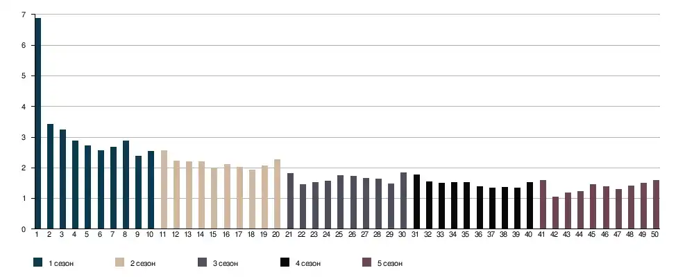 | Всего эпизодов | 10 | 10 | 10 | 10 | 10 | 13 | 63 | |||