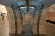 Достаточно неординарная по своей конструкции станция с узкими пилонами, однако сравнительно небольшая глубина позволила раскрыть эти пилоны ещё и в середине. В итоге пилоны исчезли, остались кольца из белого мрамора, чередующиеся со сводом. Всё это соединено световой линией из латунных труб в центре зала. Путевые стены облицованы розовым мрамором.