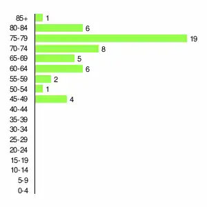 | Жителей | 488 | 594 | 514 | 411 | 231 | 181 | 138 | 88 | 52 |