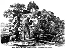 Не без труда добрались мы до вершины Лысой горы; тут проводник указал нам на небольшой каменной скале высеченные слова, которые время уже поизгладило; как ни старались мы узнать содержание надписи, но не смогли ничего разобрать: многие литеры истреблены, а которые сохранились, те не имеют уже настоящего своего вида