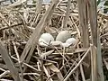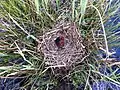 Гнездо устраивается на воде, посреди густых зарослей тростника, камыша, рогоза, ситника, ежеголовника или другого выступающего из воды растения. Обычно гнездо своим основанием опирается на дно, но также может быть и полностью плавучим, тем не менее хотя бы частично опираясь на растения. Построенное из листьев и стеблей прошлогодних трав, гнездо представляет собой грубую рыхлую кучу, размеры которой варьируются в широких пределах — их высота может составлять от 11 до 20 см, диаметр от 26 до 39 см, а диаметр лотка около 22-23 см[12]. Строят гнездо оба: самец и самка.