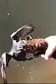 Корм добывают одинаково успешно как на берегу, так и на воде — на мелководье или плёсах. В поисках пищи на открытой воде собирают её на поверхности или под ней, погружая в воду голову, часть туловища или ныряя на глубину до 1—1.5 м[4].