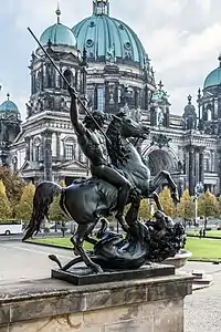 Представляет обнажённого всадника на вздыбленном коне который пронзает копьём опрокинутого на землю льва.