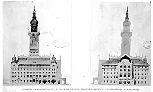 | Современный вид | Чертежи, 1908 | Макет-реконструкция средневековой ратуши | Вид со смотровой площадки ратуши на восточную часть Львова |