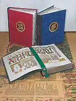 Трилогия Дж. Р. Р. Толкиена «Властелин колец»"Изобразительный язык рождался в первую очередь из богатейшего наследия европейского романского средневековья. «Романистика» предельно приближена к легенде, сказанию, имеет архаико-орнаментальный облик, выразительную грубость и плоскостность. Полосы набора забирались в сюжетно-орнаментальную раму, зеркально-симметричную в развороте (все разные!). Вообще же должны были появиться три «средневековообразных» фолианта, три монументальных «книжищи с алыми и чёрными буквицами» о которых мечтал Сэм, которые прочтут у камина или у настольной лампы с абажуром. Современные по конструкции и стилистике переплёты оттенили внутреннюю стилизацию средневековья — крытые бархатистым, глубоким по цвету материалом сторонки с грубыми толстокожими корешками вступили во взаимодействие. Кожаные медальоны с золотым тиснением вмонтированы в оптический центр лицевой сторонки, на корешках факсимиле писателя и номер тома. Тома вкладываются в футляры с двусторонними орнаментальными иллюстрациями. В 2005 году три тяжёлых тома лежали передо мной на столе…"[1]