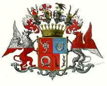 В щите расчетверенном, с золотою окраиною и графскою короною, в первом поле, красном, серебряная роза, из-под которой выходят три серебряные же резца, два концами вверх, а третье вниз; во втором, голубом, золотой кавалерский крест, полуокруженный снизу серебряною подковою; в третьем, красном, серебряная повязка, связанная в кольцо, с концами вниз обращенными; в четвертом же, напол разделенном, в правой, красной половине, буйволовый рог, а в левой, серебряной, олений рог ветвями влево.