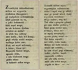 - Hanka, Václav. Kralodworský rukopis. Sebrání lyricko-epických národních zpěvů, věrně v původním starém jazyku, též v obnoveném pro snadnější vyrozumění, s připojením německého přeložení. Starobylých skládání Díl zvláštní.. — Bohumil Haas a Josef Kraus, 1819. — P. 2.