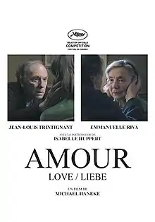 «Любовь» (фр. Amour) — французско-немецко-австрийский художественный фильм, камерная драма режиссёра Михаэля Ханеке, премьера которой состоялась на 65-м Каннском кинофестивале, где лента получила главный приз — «Золотую пальмовую ветвь». В главных ролях, пожилых учителей музыки, задействованы Жан-Луи Трентиньян и Эмманюэль Рива, во второстепенной роли их дочери Евы — Изабель Юппер.