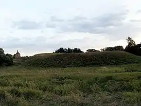 В 200 м к юго-востоку от городища, согласно клировой ведомости за 1915 г., помещик Щербачев в 1662 г. построил каменную церковь во имя Святителя Чудотворца Николая. Однако, судя по архитектуре «московского барокко», её можно скорее отнести к XVIII веку. И действительно, по клировым ведомостям Перемышльского уезда, эта церковь была возведена в 1769 г. Остается предположить, что Щербачев в середине XVII столетия соорудил деревянный, а не каменный храм.