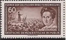 Ро́за Лю́ксембург[7] (нем. Rosa Luxemburg, польск. Róża Luksemburg, настоящее имя Rosalia Luxenburg — Розалия Люксенбург, псевд. Róża Kruszyńska, Maciej Rózga, Spartakus; 5 марта 1871, Замосць, Царство Польское, Россия — 15 января 1919, Берлин) — польско-немецкий теоретик марксизма, философ, экономист и публицист. Одна из наиболее влиятельных деятелей немецкой и европейской революционной левой социал-демократии. Участвовала в работе кружка польских политических эмигрантов, стоявшего у истоков революционной социал-демократии Польши, вела борьбу против национализма Польской социалистической партии (ППС). За антивоенную агитацию в годы Первой мировой войны подверглась репрессиям — суммарный срок, проведённый в тюрьмах, составил около 4 лет. Одна из основателей антивоенного Союза Спартака и Коммунистической партии Германии. Схвачена и убита вместе с соратником по партии Карлом Либкнехтом после подавления восстания берлинских рабочих в январе 1919 года[7].