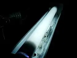 При работе люминесцентной лампы между двумя электродами, находящимися в противоположных концах лампы, горит дуговой разряд[4][5]. Лампа заполнена смесью инертного газа и паров ртути. Проходящий через газообразное рабочее тело лампы электрический ток возбуждает УФ-излучение, преобразуемое в видимый свет посредством люминесценции, внутренние стенки лампы покрыты люминофором, который переизлучает поглощаемое УФ-излучение в видимый свет. Изменяя состав люминофора, можно менять оттенок свечения лампы. В качестве люминофора до сих пор используют в основном галофосфаты кальция и ортофосфаты кальция-цинка.
