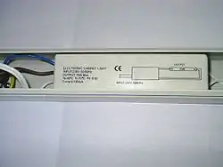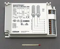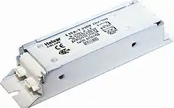 Для решения этих проблем применяют специальные устройства — балласты (пуско-регулирующие аппараты). Наиболее распространённые на сегодняшний день схемы подключения: с электромагнитным балластом (ЭмПРА) и неоновым стартером, и с электронным балластом (ЭПРА; существует много различных моделей и вариантов).