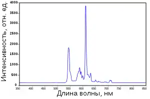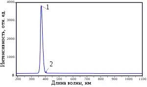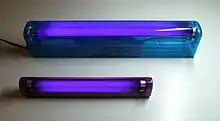 - Ультрафиолетовые люминесцентные лампы с колбами из «чёрного» стекла: Различные материалы обладают способностью преобразовывать невидимое ультрафиолетовое излучение в световое (создавать эффект флуоресценции). Такие лампы представляют собой облучатели с длинноволновым ультрафиолетовым излучением, использующие данный эффект. Поэтому они часто применяются в качестве источников излучения для любых видов исследований с применением люминесцентного анализа. Эти лампы отличаются от стандартных люминесцентных ламп тем, что их колба изготовлена из специального стекла, практически непрозрачного в видимой области и пропускающего ближнее УФ-излучение, и покрыта специальным люминофором, излучающим в узкой спектральной области около 370 нм. Такие лампы излучают практически только в длинноволновом ультрафиолетовом диапазоне от 350 до 410 нм, которое почти невидимо глазом и совершенно безвредно (кроме полос излучения люминофора в спектре имеются хорошо видимые линии 365,0153 нм и 404,6563 нм, а также линии 398,3931 нм и 407,783 нм[15][16]). Практически всё видимое излучение, а также более коротковолновое ультрафиолетовое излучение задерживаются стеклом колбы лампы, выполняющей также функцию светофильтра. Области применения: