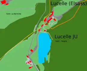 Таким образом, посёлок, расположенный на границе, разделён между двумя странами: в Северной половине, входящий во Французский департамент Верхний Рейн насчитывается 39 жителей (2012), а Южная половина фактически является частью коммуны Плин (нем. Pleigne), в швейцарском кантоне Юра. На этой территории расположено аббатство Люсель — важный религиозный центр с начала 12 до конца 18 века. Деревушка, которая находится в Южной части, отделена от территории монастыря (аббатства) государственной границей. Южная часть принадлежала князю епископства Базель и в 1815 году отошла к Швейцарии (Северная часть, с основными постройками монастыря, относится к Франции с 1648 года).