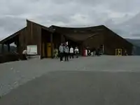 | Вид на «орлиное гнездо». Хорошо видна огороженная смотровая площадка, опоясывающая здание по периметру. | Вид снизу на здание кафе и смотровую площадку | Вход в кафе, вид с парковки. На заднем плане — отвесные стены фьорда. |