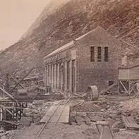 | На дальнем плане можно увидеть вход в новую электростанцию, прорубленный в скале. | Машинный зал электростанции. Помещение полностью вырублено в скале, на что указывает дальняя стена, представляющая собой скальный монолит. |