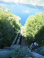 Вода для электростанции бралась из водоёмов в горах, которая доставлялась сначала по одной трубе, а позднее по двум трубам, проложенным по скалистому склону фьорда. Эти трубы сохранились до наших дней. Вдоль труб построен фуникулёр и идёт самая длинная деревянная лестница в мире.[17]