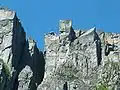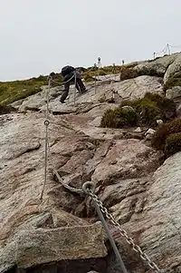 | Три подъёма и два крутых спуска. Общий набор высоты около 500 метров. | Провешенные металлические перила — хорошее подспорье во время подъёма. |