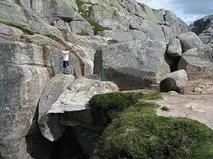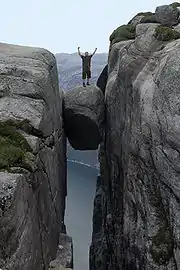 | Kjeragbolten. Вид сзади. Проход на камень достаточно безопасен. Мальчик с поднятыми руками позирует на камне. | |||