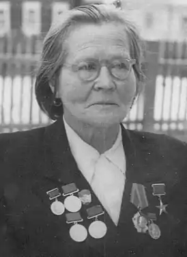 В 1948 году вырастила в течение года в среднем по 30 поросят от 8 свиноматок. 6 мая 1949 года Указом Президиума Верховного Совета СССР удостоена звания Героя Социалистического Труда «за получение высокой продуктивности животноводства в 1948 году при выполнении колхозом обязательных поставок сельскохозяйственных продуктов и плана развития животноводства по всем видам скота» с вручением Ордена Ленина и золотой медали «Серп и Молота»[1].