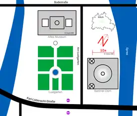 ![]() Люстгартен, вид на северо-восток, на Берлинский кафедральный собор и Дворец Республики, 2006 год | |
