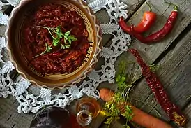 Лютеница — болгарская закуска из помидоров и сладких перцев[1]. Также — соус, приправа. Название, вероятно, происходит от слова «лютый», то есть «сильный», «чрезмерный». В состав лютеницы входят перетёртые острый красный перец, сладкий перец, томаты, чеснок, петрушка, растительное масло, уксус, молотый чёрный перец, соль, сахар. Иногда к перечисленным овощам добавляют баклажаны, репчатый лук, морковь. При этом основу соуса составляют сладкие болгарские перцы, обычно сорта капия, которые предварительно запекаются. Во время осеннего сбора урожая овощей лютеницу обычно заготавливают на зиму впрок и закатывают в банки. Есть в продаже в готовом виде готовая к употреблению. Подают к мясу, рыбе, овощам или в качестве закуски. Лютеницу часто намазывают на хлеб, ею заправляют блюда из картофеля, риса или макарон. Традиционный болгарский салат с луком и варёной фасолью готовят с лютеницей.