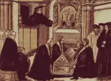 Лютера отпустили из Вормса, поскольку ему предварительно была выдана императорская охранная грамота, но 26 мая 1521 года был издан Вормсский эдикт, осудивший Лютера как еретика[6]. По пути из Вормса, вблизи деревни Эйзенах, придворные курфюрста Фридриха Саксонского по просьбе своего господина инсценировали похищение Лютера, тайно поместив его в замок Вартбург[* 1][7]; некоторое время многие считали его погибшим. В замке Лютеру якобы являлся дьявол[8], но Лютер приступил к переводу Библии на немецкий язык, редактировать который ему помогал профессор теологии Виттенбергского университета Каспар Круцигер[9].