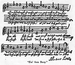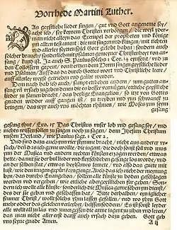 Вопрос о том, насколько велик персональный вклад Лютера в музыку протестантской церкви, на протяжении веков неоднократно пересматривался и остался дискуссионным. Некоторые церковные песни, написанные Лютером при активном участии Иоганна Вальтера, вошли в первый сборник четырёхголосных хоральных обработок «Книжечка духовных песнопений» (Виттенберг, 1524)[* 5]. В предисловии к нему (см. приведённое факсимиле)[* 6] Лютер писал: