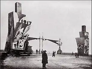 - Украшение моста Равенства (Троицкого моста) к 10-летию Октябрьской революции (1927), соавтор И. И. Фомин