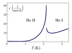 Ранние экспериментальные исследования теплоемкости[1] привели к гипотезе, что она имеет логарифмическую особенность в лямбда-точке, и в частности стремится там в бесконечность. Более точные эксперименты[2][3] опровергли эту гипотезу, которую ещё можно встретить в университетских учебниках.[4] В настоящее время надежно установлено,[5] что поведение теплоемкости вблизи лямбда-точки описывается формулой , где есть приведенная температура, температура лямбда-точки, константы принимающие различные значения выше и ниже точки перехода, а критический индекс. Так как этот индекс имеет отрицательное значение для перехода в сверхтекучее состояние, теплоемкость в лямбда-точке имеет конечные (хотя и большие) пределы при приближении с низких и высоких температур .[6]