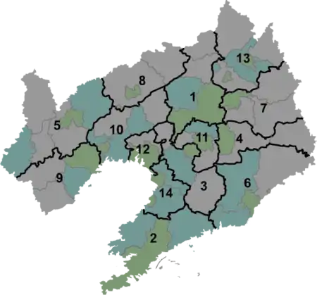 Провинция делится на 12 городских округов и 2 города субпровинциального значения: