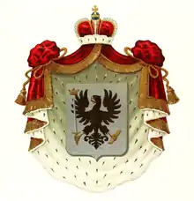 В щите, имеющем серебряное поле, изображён чёрный одноглавый орёл, держащий в правой лапе меч, а в левой — золотой брусок, и над мечом видна корона. Щит покрыт мантией и шапкой, принадлежащими княжескому достоинству.