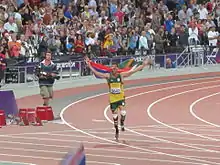 Оскар Писториус (ЮАР) празднует победу на дистанции 400 м — класс T44
