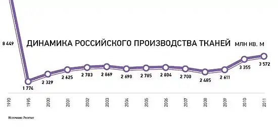 Лёгкая промышленность России в 2005 году включала около 14 тысяч предприятий и организаций, из которых 1437 относились к крупным и средним[6]. Тем не менее, 70 % объёма производства приходится на 300 наиболее крупных предприятий[8]. Общая численность занятых в отрасли составляла свыше 550 тыс. человек, из них 80 % — женщины. Доля продукции, производимой по заказам силовых структур, составляла около 11 % от общего объёма выпуска продукции лёгкой промышленности. Объёмы производства продолжают сокращаться; в 2005 году по сравнению с 2004 годом объёмы производства в текстильной и швейной промышленности сократились на 1,5 %, в кожевенной и обувной промышленности — на 2,7 %[6]. Доля российского производства в общем объёме оборота товаров лёгкой промышленности в России составляет всего 20 %[9]. В лёгкой промышленности функционируют 20 специализированных научно-исследовательских институтов[10].